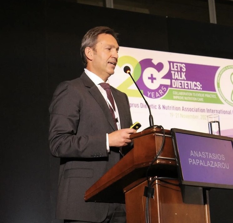 O Δρ. Αναστάσιος Παπαλαζάρου παρευρέθηκε στο 11ο Cyprus Dietetic and Nutrition Association International Conference την Παρασκευή 19/11/2021, όπου ανέπτυξε τη σημασία της Διατροφής στην προ εγχειρητική ετοιμασία πριν το χειρουργείο. Τα prehabilitation προγράμματα έχουν, παγκοσμίως, μαγνητίσει το επιστημονικό ενδιαφέρον. Μελέτες δείχνουν ότι μειώνουν τις μετεγχειρητικές επιπλοκές, αυξάνουν τη λειτουργικότητα / κινητικότητα του ατόμου, μειώνουν το χρόνο παραμονής στο νοσοκομείο και γενικότερα, βελτιώνουν τη μετεγχειρητική ποιότητα ζωής του ασθενή, εξοικονομώντας, παράλληλα, χρήματα από το δημόσιο σύστημα υγείας.