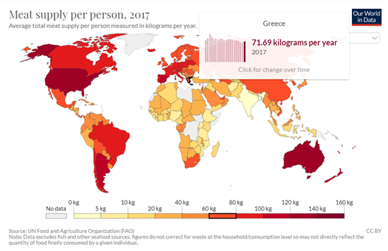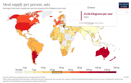 Όπως βλέπουμε και στον χάρτη, δεδομένα από το 1961 δείχνουν πως στην Ελλάδα οι προμήθειες κρέατος ανά άτομο ήταν περίπου 21 κιλά ετησίως.
