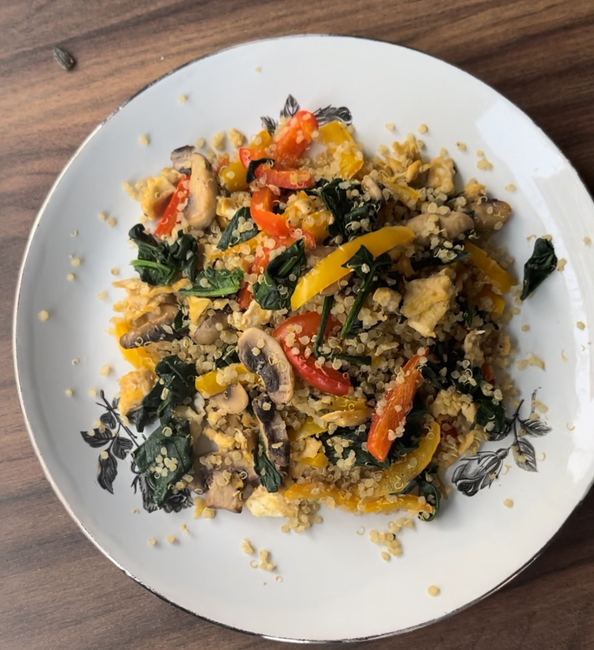 Προσθέτουμε την κινόα, τα λαχανικά και ανακατεύουμε για μερικά λεπτά και σερβίρουμε.