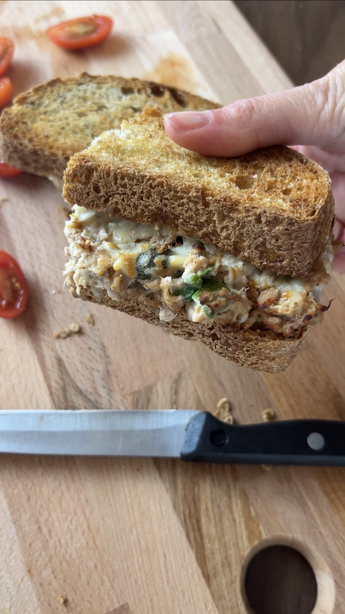 - Καλύπτουμε με μια δεύτερη φέτα ψωμί και ψήνουμε στο airfryer στους 200 βαθμούς για 6 λεπτά ή στον φούρνο στους 220 βαθμούς για 8 λεπτά.