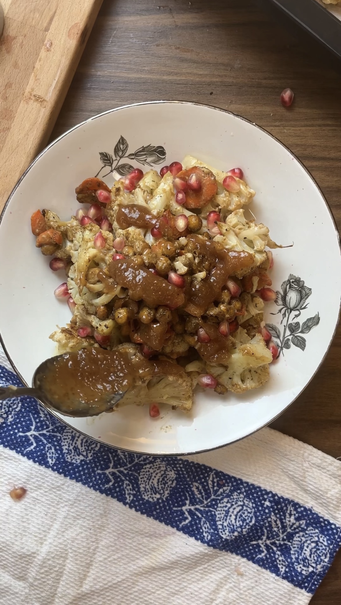 Ζεστή πικάντικη σαλάτα με κουνουπίδι, crispy ρεβύθια και έδεσμα από βασιλικά σύκα από την Figland.